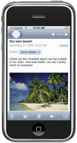 Из интернет-возможностей iPhone обладает браузером Safari (вот здесь в полной мере проявляется потенциал Mac OS X, в частности, движка браузера), почтовым клиентом Mail, картами от Google и виджетами. Все эти компоненты, судя по представленным демонстрациям, сделаны очень хорошо.